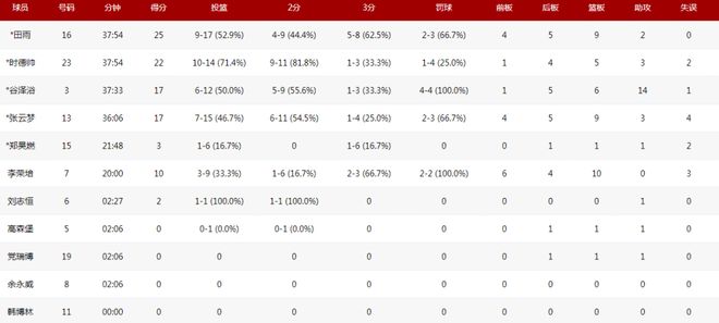 天津全运男篮:田雨25分9板2助、时德帅22分5板3助4断、谷泽浴17分6板14助4断、张云梦17分9板3助、李荣培10分10板。