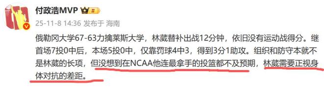 对于这两场比赛林葳的表现,媒体人付政浩也发文总结——组织和防守本来就不是林葳的强项,但没想到在NCAA,他连最基本的投篮都不达预期,林葳需要正视身体对抗的差距。